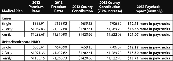 In response to SEIU 721’s initial bargaining proposal, the County will increase its contribution by 7.2% – more than enough to fully cover the Kaiser and United Healthcare HMO premium increases, which means more money in paychecks (see chart below).
