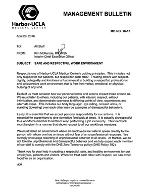 Harbor-UCLA CEO Kim McKenzie also sent out her own memo to all staff imploring them to comply the DHS Zero Tolerance policy (DHS Policy 792) and encouraging reporting unprofessional behavior at all levels. The memo comes just a month after 721 members at Harbor-UCLA held a unity break at the facility, and spoke out in a widely circulated video on the bullying crisis at DHS and Harbor-UCLA.