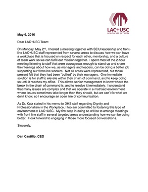 Health providers at DHS have highlighted the common practice of “shuffling around” managers who violate the zero tolerance code of conduct, but are never truly held accountable for their behavior. In fact 721 members first flagged this particular bully manager to CEO Dan Castillo in October of 2014 when they personally met with him on the issue, and followed up with a package containing numerous affidavits documenting the reports of bullying.The affidavits were given to Dan Castillo only after their original submission to Human Resources in February of 2014 went unaddressed. The problem was never resolved and only worsened, prompting the launching of an anti-bully campaign and the formation of Bully Watch at LAC+USC.