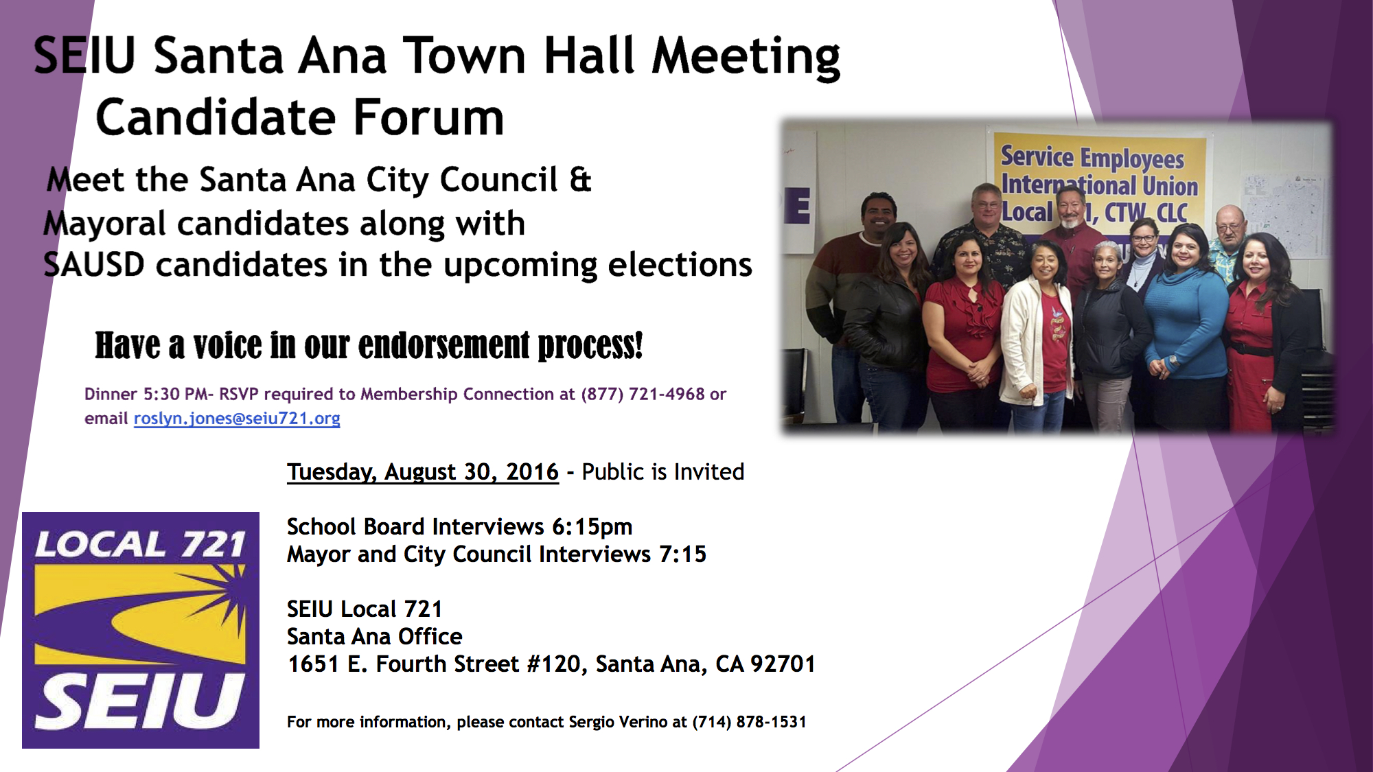 Join us on Tues., Aug. 30 when the Santa Ana Chapter of SEIU Local 721 interviews candidates for the Santa Ana City Council and School Board! Dinner starts at 5:30 p.m. and Q&A begins at 6:15 p.m.