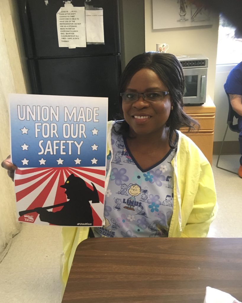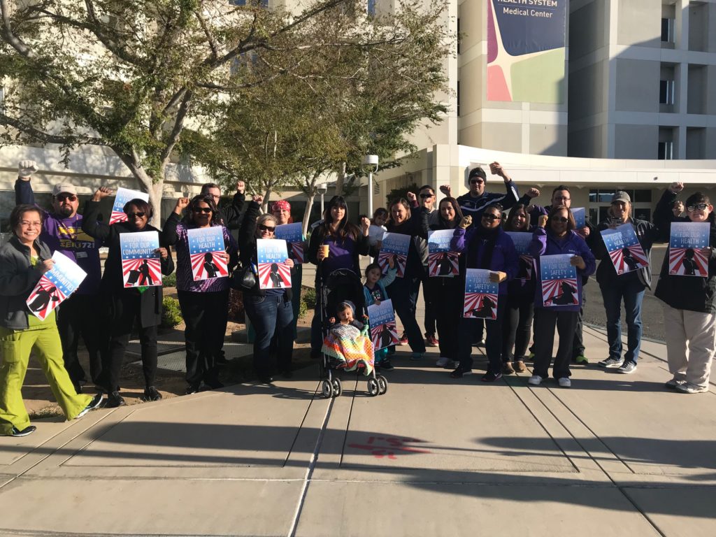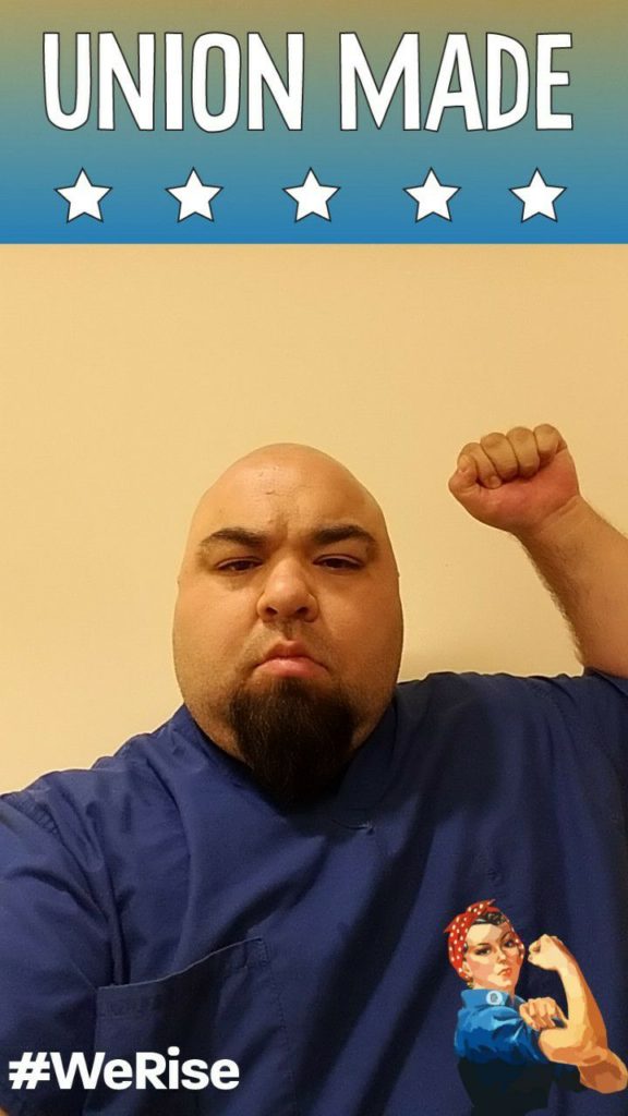 In addition to the gathering at the hospital, SEIU 721 members held satellite demonstrations at their worksites, wearing stickers, hanging posters and even using a special Facebook filter.