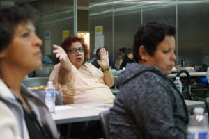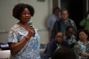 EVS workers, nurses, clerks and staffers in a variety of other classifications packed an auditorium on the hospital’s campus for a Town Hall that was arranged by LA Supervisor Hilda Solis’ office.