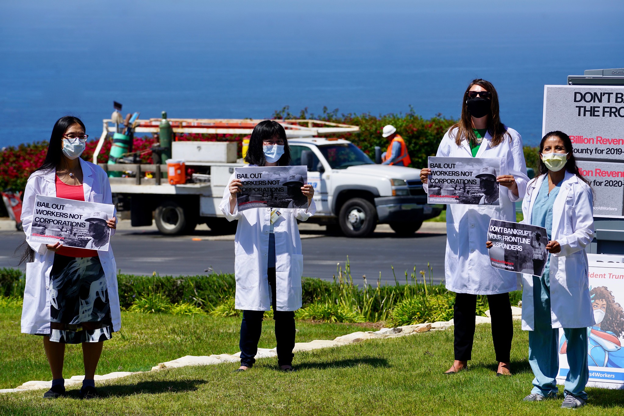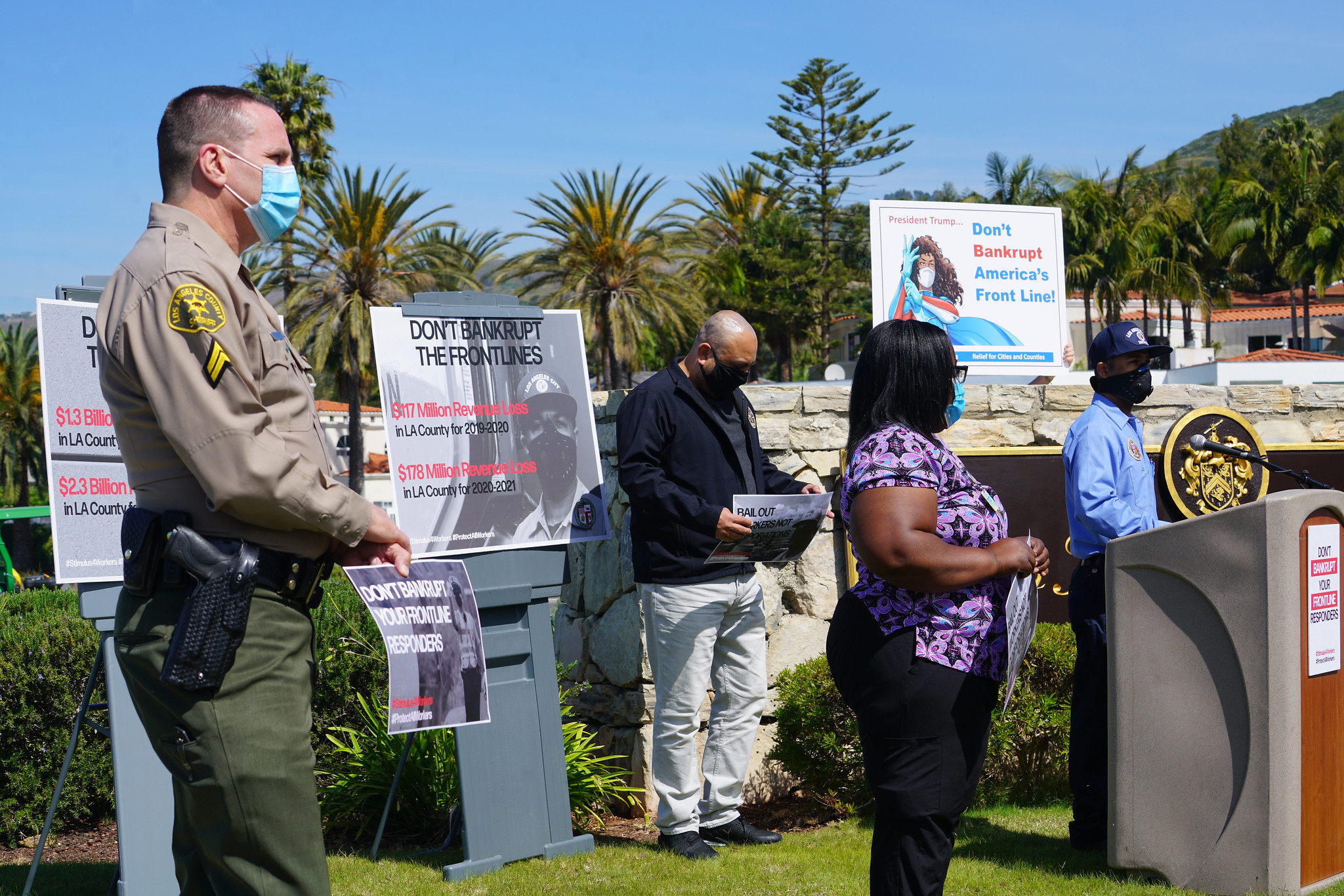 Wednesday morning, SEIU 721 members joined with other COVID-19 frontline union workers outside of Trump National Golf Club in Palos Verdes to tell the federal government, “Don’t bankrupt the front line!”