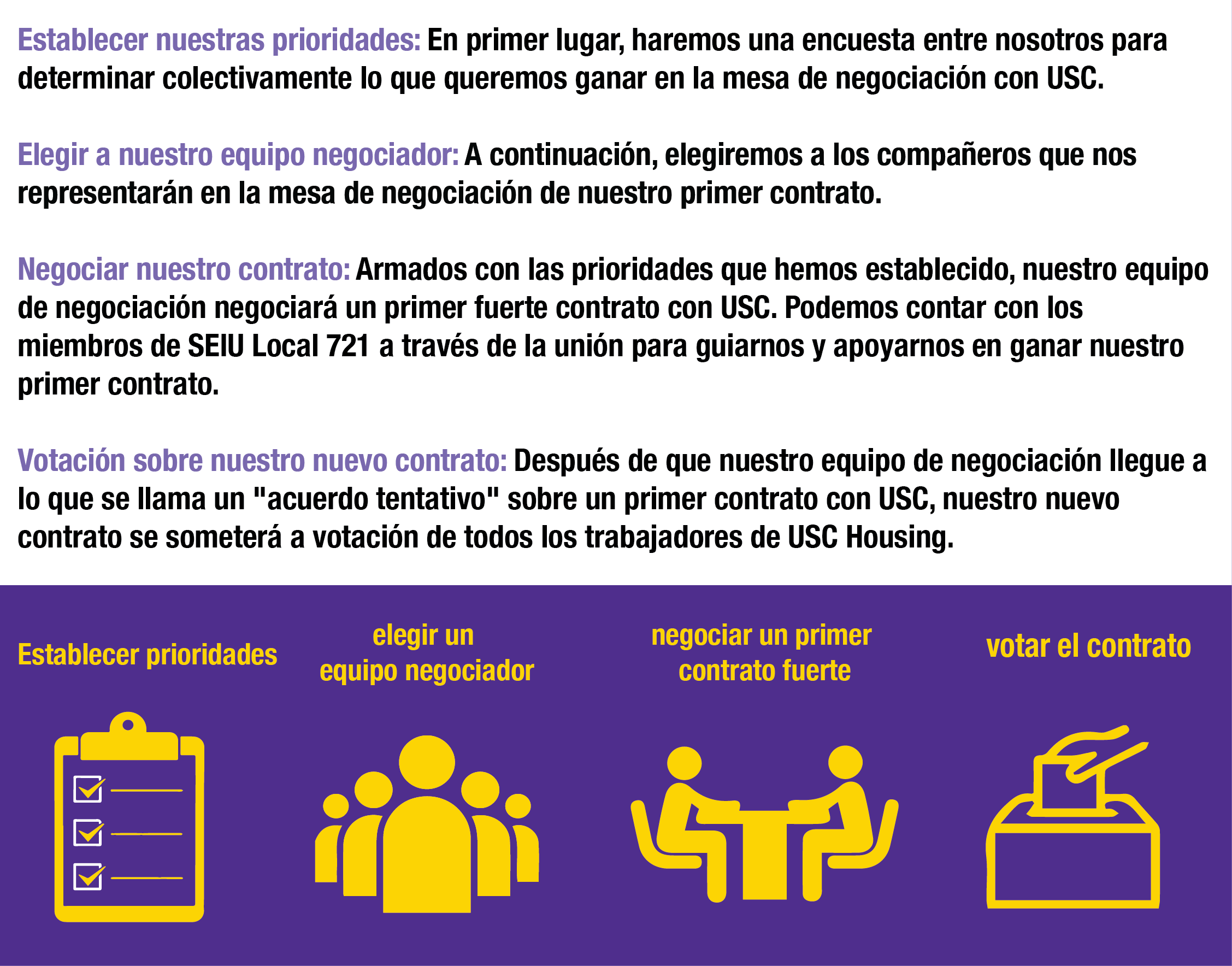 El siguiente paso: La mesa de negociaciones, donde estaremos negociando con USC para mejorar nuestros salarios, beneficios y condiciones laborales.