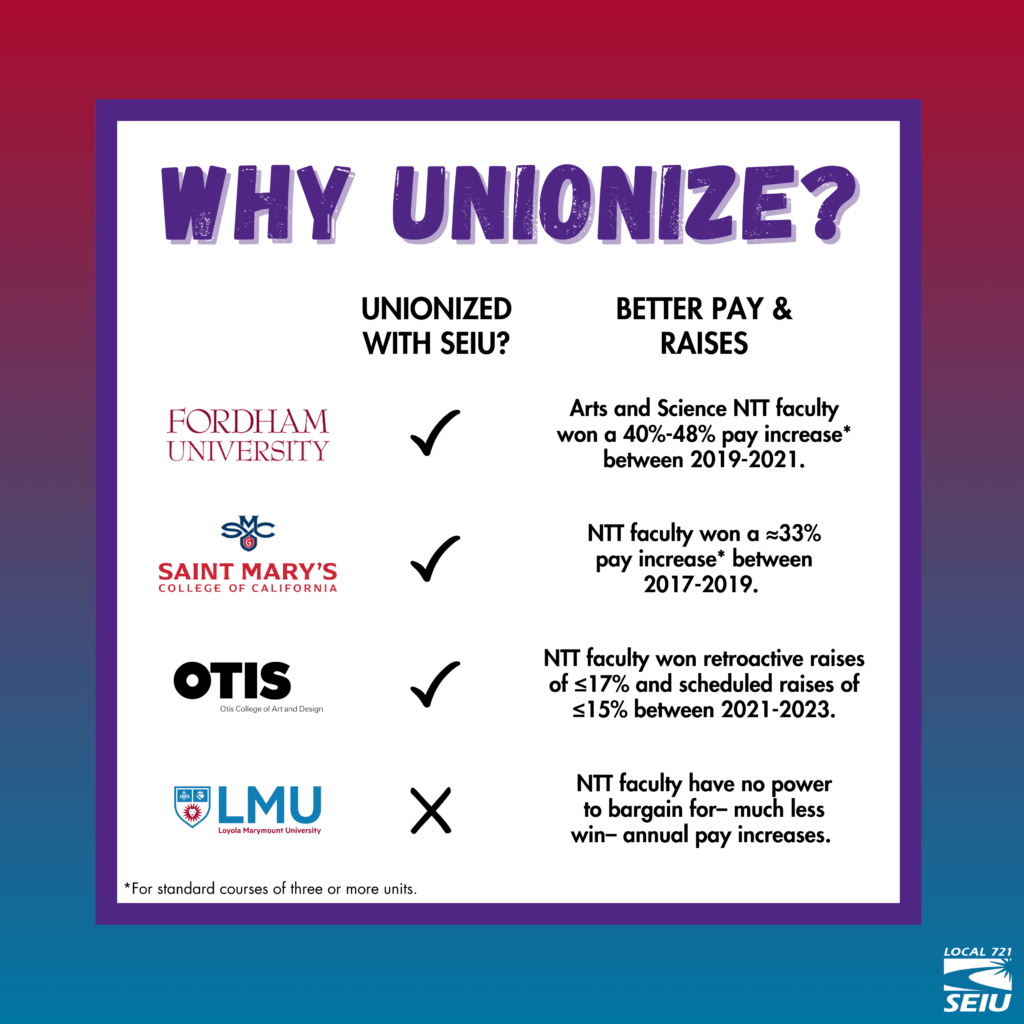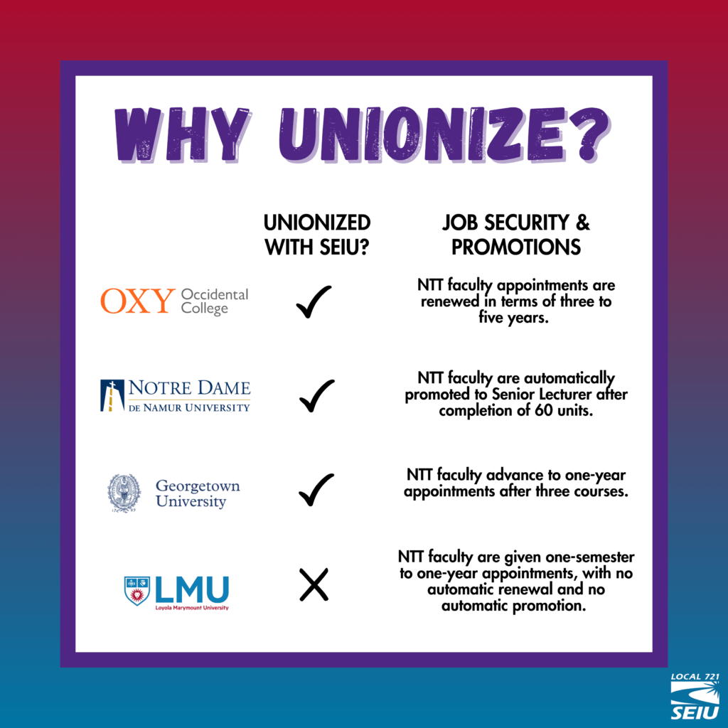 Non-tenure track (NTT) faculty at LMU are forming a union because something doesn’t add up and we deserve more– better pay, more advancement opportunities, job security & a voice on the job. #LMUnion