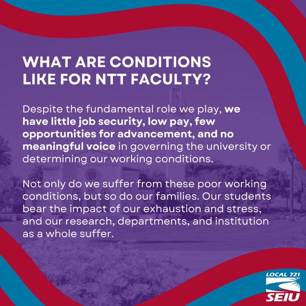 Non-tenure track (NTT) faculty are the backbone of LMU. We carry some of the heaviest course loads for low pay, little job security & limited voice.