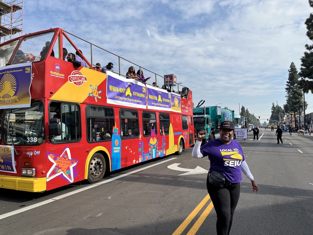 Marching members waved at spectators assembled on the street while walking the nearly two-mile route along Martin Luther King Jr. and Crenshaw Boulevards. Other members wished a “Happy King Day” to onlookers from a double-decker bus decorated in SEIU 721 banners that followed closely behind the marchers on foot.