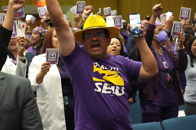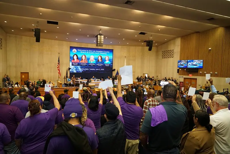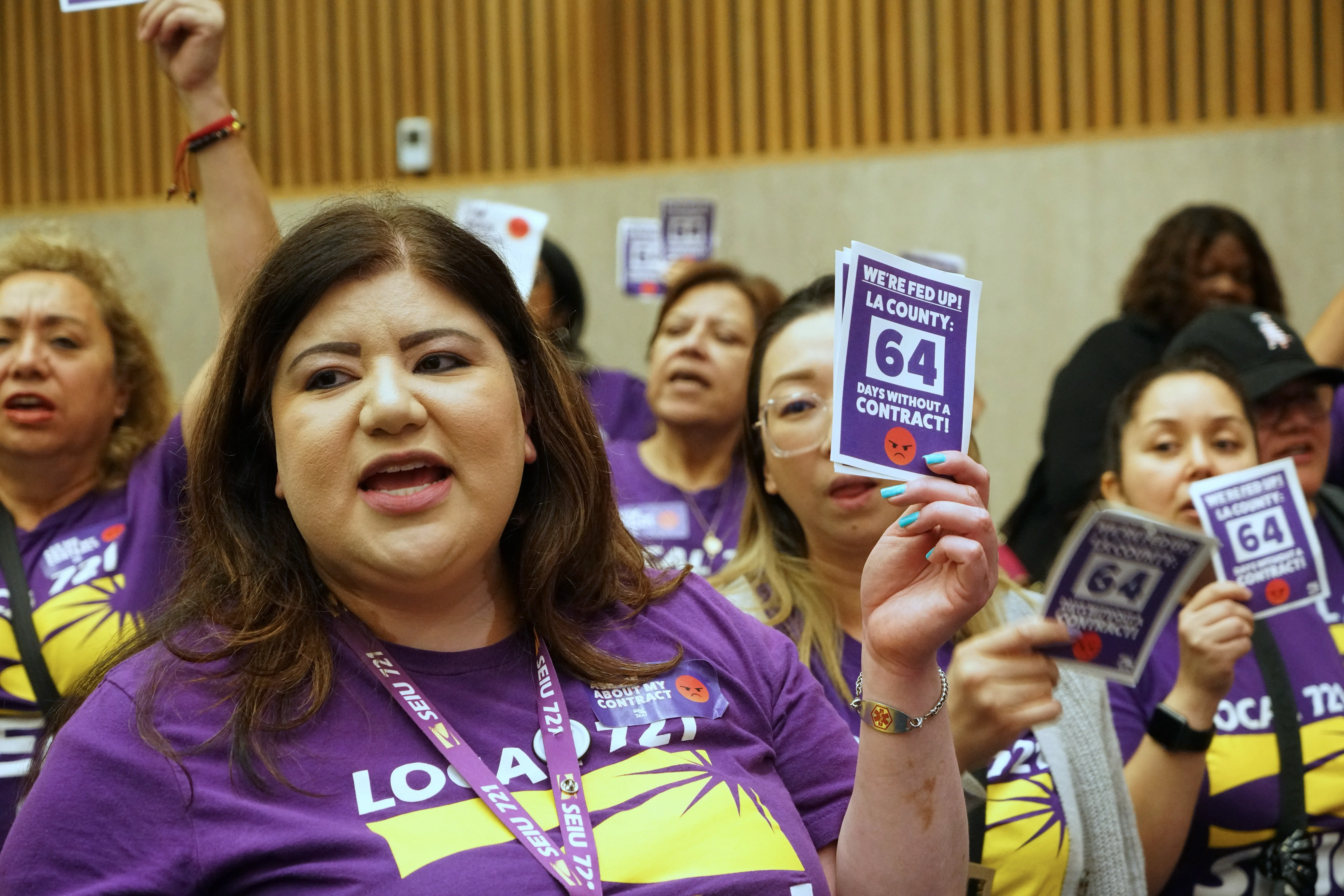 LA County members and clergy allies quickly complied, dominating Board chambers with chants and placards with the number “64” that expressed indignation with the Supervisors’ bad faith bargaining tactics that have left County members working without a contract for more than two months.