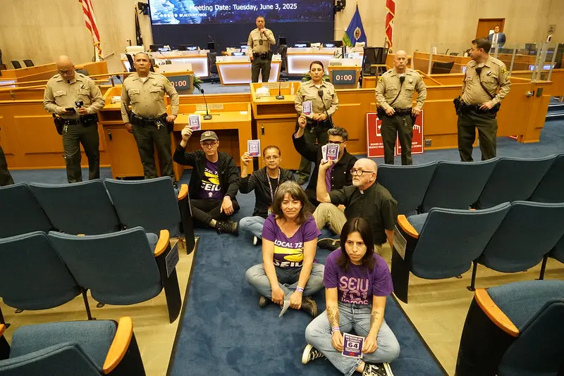 Outraged by Los Angeles County management’s continued slow-rolling of the contract bargaining process, hundreds of our LA County members joined our clergy allies at today’s Board of Supervisors meeting to pack the chambers and shut it down. Today’s action culminated with the arrest of six union members and clergy allies who engaged in non-violent civil disobedience inside Board chambers as the official meeting took place.