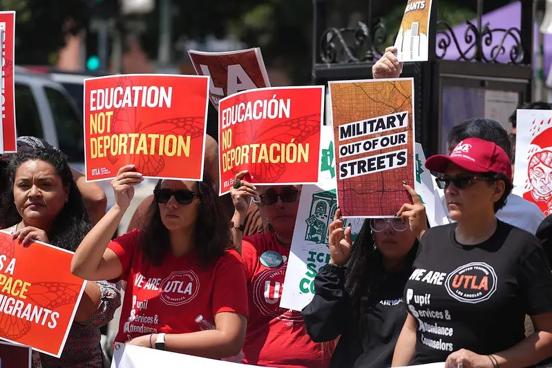 “I teach high school seniors,” said Thalia, a teacher with UTLA and the mother of two children. “It is usually a period of joy. This year, there is a lot of anxiety. The presence of a military-style immigration operation threatens the public. UTLA is here. We are not going to back down. The real crisis is escalation by immigration authorities. Our schools will always be welcoming places.”