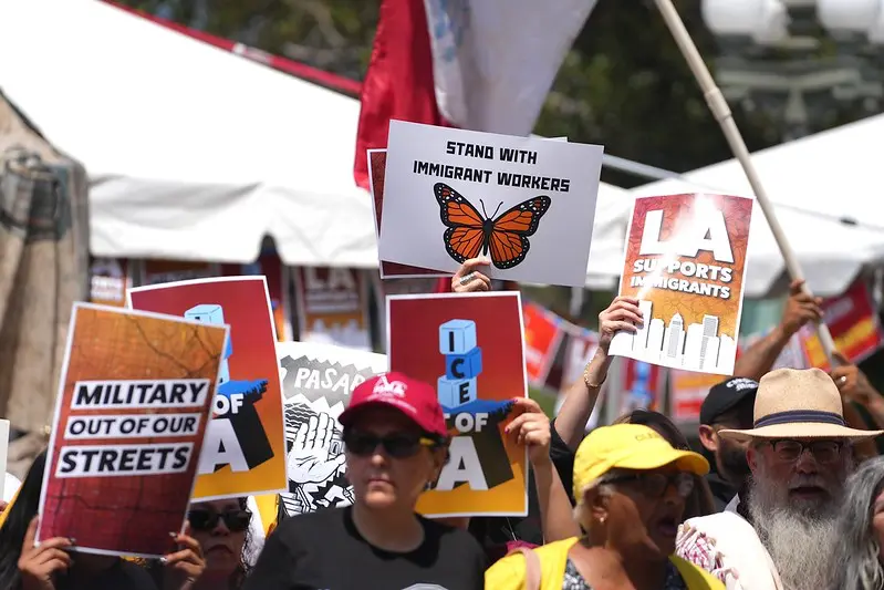 Against the backdrop of a massive replica of the Declaration of Independence, members of SEIU 721 joined forces with other labor unions, immigration activists, local faith leaders, artists and people affected by ICE raids to launch the “Summer of Resistance” at La Placita Olvera in downtown LA today. The lively gathering kick-started a month-long rapid response effort and movement for peaceful protest in answer to the Trump regime’s ICE raids throughout Southern California.