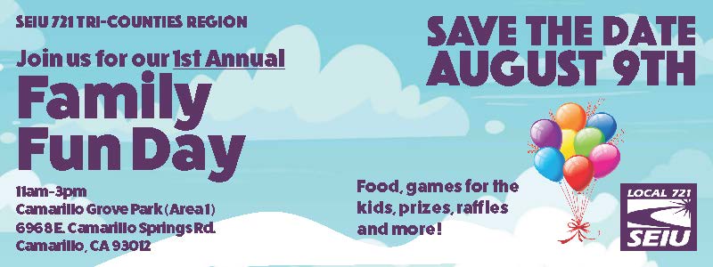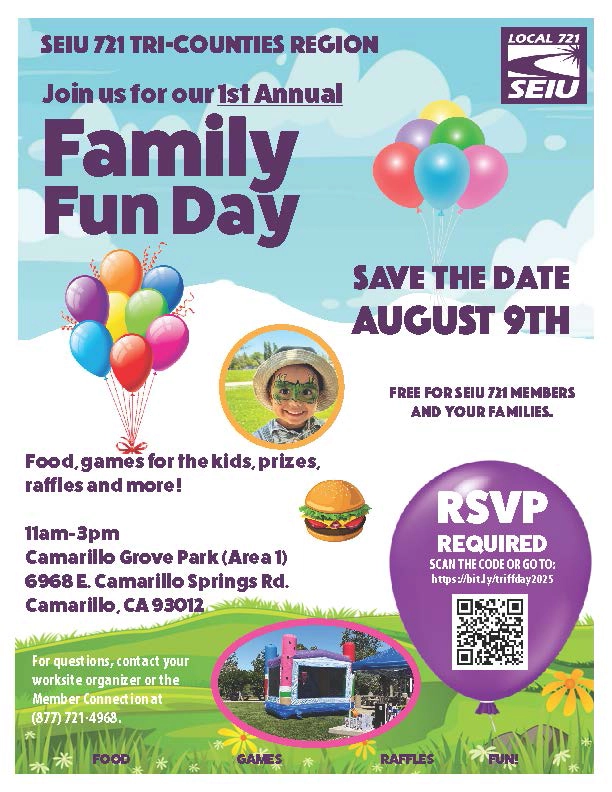 Join us on Saturday, August 9, 2025, for a family fun day/member appreciation for all SEIU 721 members in the Tri-Counties region! Save the date and make sure to RSVP so we can secure a spot for you.