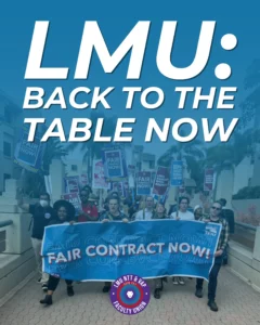 “This [ULP strike authorization] vote sends a message to LMU’s admin and board: We’re ready to fight. LMU must get back to the bargaining table so we can negotiate a fair contract in good faith. We’ve garnered support from people across the Los Angeles region and the nation, and our students, LMU staff, faculty colleagues, and alumni stand with us.”