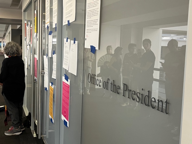 Later, a delegation of students and community supporters attempted to deliver to LMU President Thomas Poon more than 20 letters written by student organizations and community groups demanding that the university return to the bargaining table with NTT faculty. Poon didn’t respond to knocks, so the delegation members posted the letters on his office door.