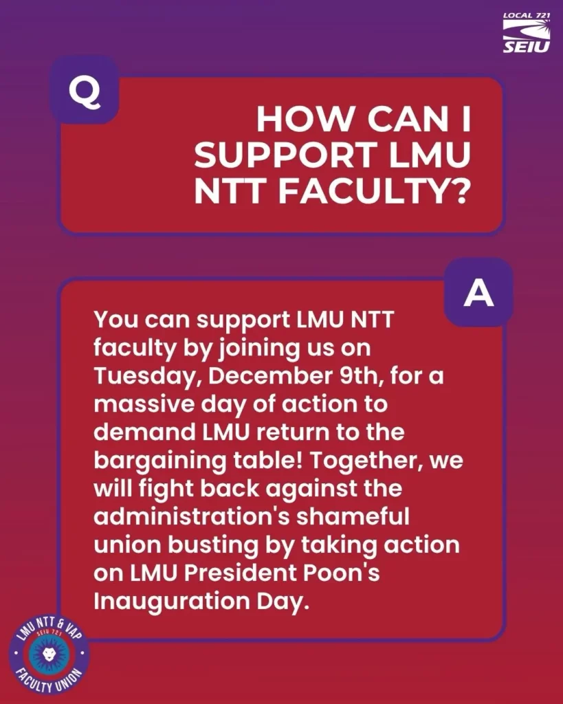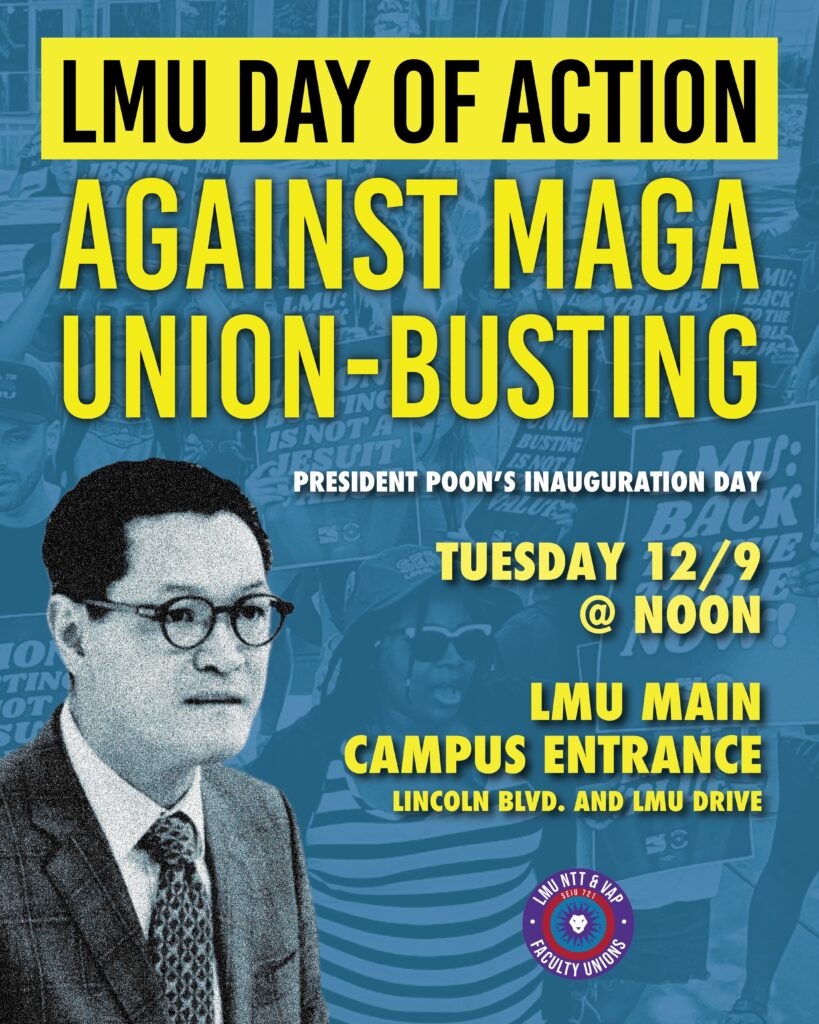 Join LMU students, faculty, staff, alumni, and union and community supporters on Tuesday, December 9th, for a massive day of action to demand LMU return to the bargaining table with unionized non-tenure track (NTT) faculty! Together, we will fight back against the administration’s shameful union-busting by taking action on LMU President Poon’s Inauguration Day.
