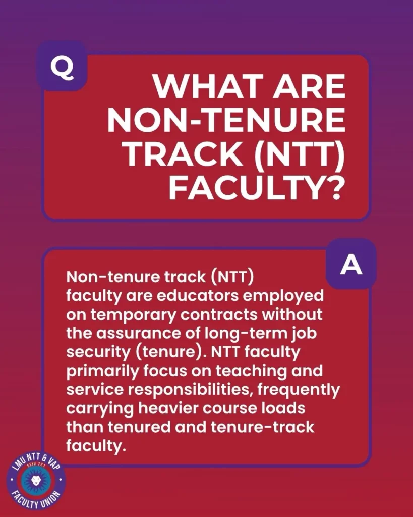 Non-tenure track (NTT) faculty make up roughly 65% of LMU’s teaching force. We teach the classes, mentor the students, and keep the university running. We are the backbone of LMU, and it’s time we’re valued like it.