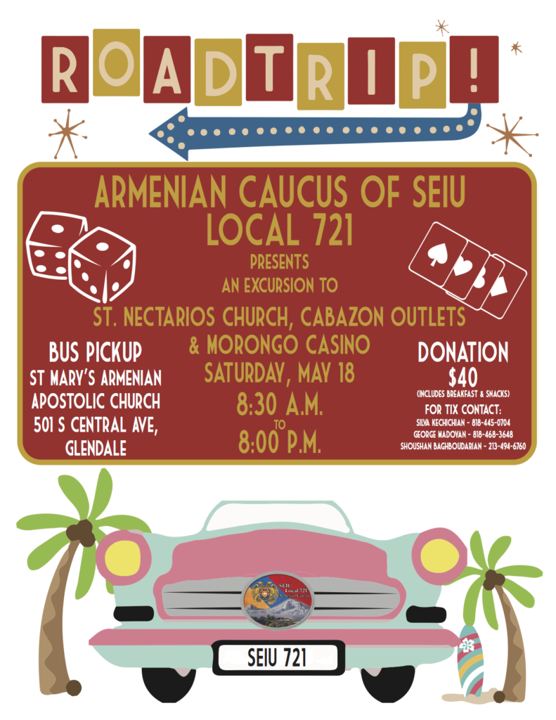 Join the SEIU 721 Armenian Caucus for a road trip to St. Nectarios Church, the Cabazon Outlets and Morongo Casino!