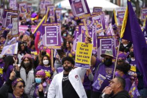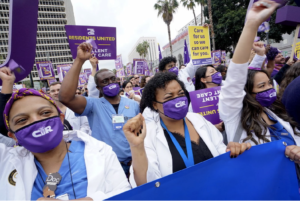 The strike began Monday at 7 p.m. and on Tuesday, it’s estimated that 10,000 union members flooded the streets of downtown LA. A sea of purple marched from the Hall of Administration, where the Board of Supervisors was meeting, and made its way to 5th and Figueroa streets.