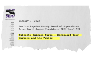 We’re Urging the LA County Board of Supervisors to take Emergency Action on the Latest Surge - The number of COVID-19 cases has surged by 430% over the last two weeks. Just yesterday alone, LA County recorded almost 37,000 positive cases, with over 8,600 people hospitalized throughout California. That’s why today, our SEIU 721 President David Green delivered official correspondence to the LA County Board of Supervisors calling on them … Read More