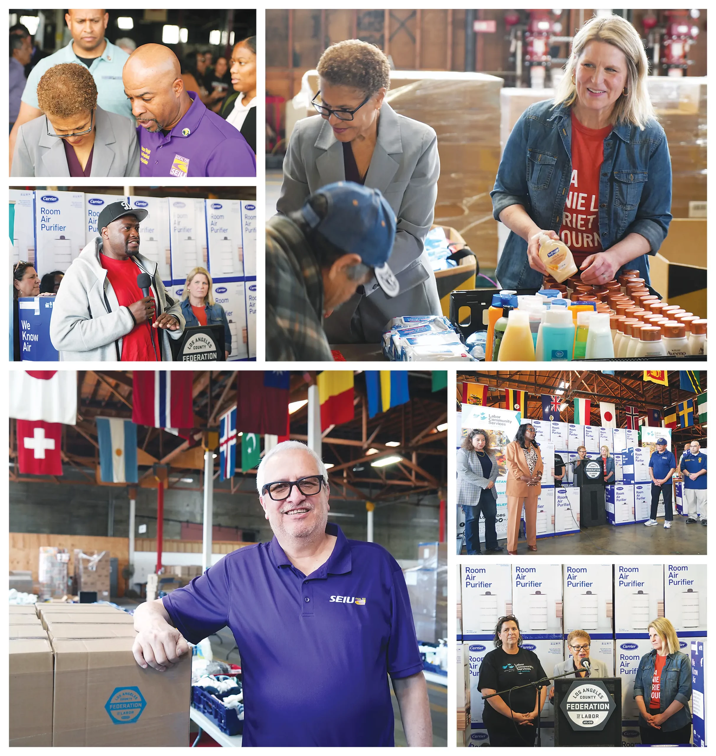 SEIU 721 Vice President Simboa Wright and Treasurer Adolfo Granados joined AFL-CIO President Liz Shuler and other labor leaders from around the LA region to deliver aid to union members affected by wildfires and discuss relief efforts with Los Angeles Mayor Karen Bass.