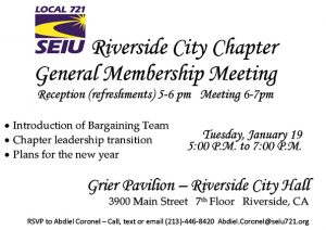 Riverside County Superior Court members will see raises of 7% over the next two years. Members will be voting on the agreement by mail. You should be receiving the ballot shortly and they must be returned to the SEIU 721 Riverside office on Tuesday, Dec. 1.